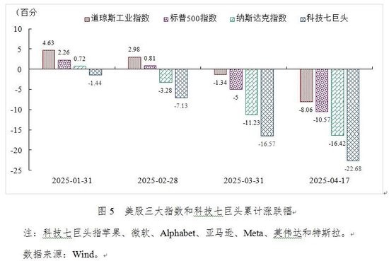 2025年1-3月,美股三大指数由涨转跌。1月2日至3月31日,道琼斯工业指数累计下跌1.34%,标普500指数累计下跌5%,纳斯达克指数累计下跌11.23%。在“对等关税”冲击下,美国三大股指跌幅进一步显著扩大(见图5)。今年以来,美股大跌的原因可总结为以下三点: