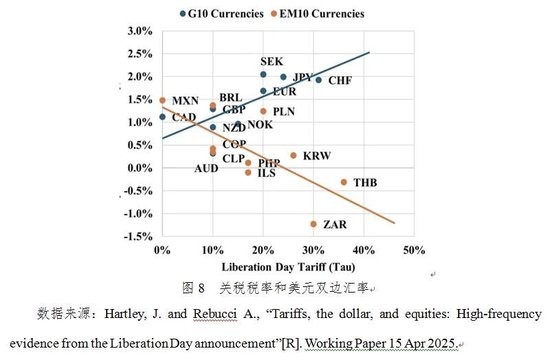从美元双边汇率来看,“对等关税”冲击下驱动美元走弱的主要原因是美元相对于G10国家货币贬值。在关税政策宣布后,几乎所有G10货币(如欧元、日元、英镑、瑞士法郎等)对美元出现1至2个百分点不等的升值幅度,反映出美元相对主要发达经济体货币普遍贬值。与此同时,美元对许多新兴市场和发展中经济体货币则表现为升值,尤其是那些汇率较为市场化的国家货币(如韩元、泰铢以及南非兰特等)相对美元普遍走弱(见图8)。美元双边汇率在发达经济体与新兴经济体之间的分化,是理解“对等关税”冲击下美元不涨反跌的关键所在。