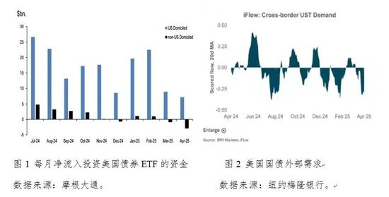 美国国债市场需求疲软主要表现在以下两个方面。一是海外持有者大量抛售美国国债。由于目前美国财政部的TIC数据只公开了截至2025年2月份的美国国际资本流动数据,我们无法详细全面了解2025年3月和4月外国投资者投资组合流入美国资产的情况,因此本文借鉴摩根大通的做法,使用ETF的每日流量来衡量外国投资者对美国国债的操作。图1显示,自2025年3月以来,外国投资者对美国债券基金的操作由2025年2月的净买入转为适度卖出,4月的净卖出规模较3月大幅增加,显示出美国国债遭遇了外国投资者的抛售。尤其是特朗普于4月2日宣布“对等关税”后,外资更是加速抛售美国国债。据纽约梅隆银行提供的跨境资金流动数据显示,自4月4日以来的11个交易日中,有8个交易日出现了外国卖盘,截至4月11日当周,外资抛售美国国债的规模 “接近偏离正常值一个完整标准差”,创下近年来最剧烈的单周抛售纪录(详见图2)。