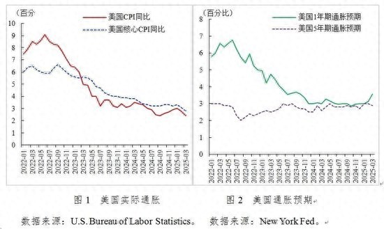 2025年一季度,美国CPI同比增速实现“三连降”。3月美国CPI同比增长2.4%,较1月和2月分别下降0.6个百分点和0.4个百分点;扣除能源和食品的美国核心CPI同比增长2.8%,较1月和2月分别下降0.5和0.3个百分点(见图1)。但在特朗普“对等关税”冲击下,美国通胀反弹成为市场一致预期。据耶鲁大学预算实验室(The Budget Lab at Yale)测算,关税冲击将显著提高美国服装和纺织品(8%)、食品(1.6%)以及汽车(8.4%)等商品价格,最终导致美国通胀上涨1.7至2.1个百分点。据纽约联储发布的《消费者预期调查》数据,美国通胀预期在关税冲击下出现分化,短期通胀预期出现较大反弹达到3.6%,但长期通胀预期仍保持稳定约为2.8%(见图2)。此外,考虑到当前美元汇率在关税冲击下不涨反跌,这在一定程度上会给美国带来输入型通胀压力。因此,关税冲击大概率会中断美国当前通胀回落态势,美国短期再通胀风险不容忽视。