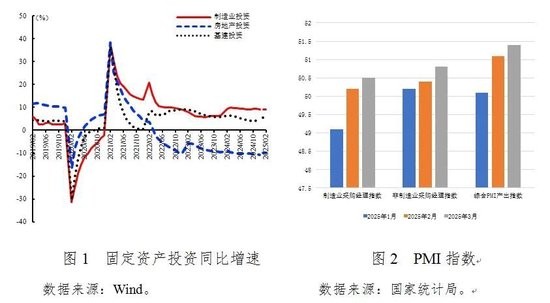 第一,宏观组合拳加力显效,PMI景气水平继续回升。一季度我国财政政策靠前发力,政府投资的带动放大作用充分发挥。随着超长期特别国债和地方政府专项债的发行使用加快,我国“两重”项目开工建设提速,3月基础设施投资同比增长5.8%(见图1);同时,大规模设备更新政策持续推进,设备购置投资增长提速,其中设备工器具购置投资同比增长19%。一方面受政府投资带动,另一方面也受促进民营经济发展措施落地的影响,社会整体投资信心有所增强。一季度我国制造业采购经理指数、非制造业商务活动指数和综合PMI产出指数均呈现上升趋势(见图2)。分行业来看,建筑业商务活动指数为53.4%,连续2个月环比上升,创2024年6月以来的新高,释放出房地产市场回暖的积极信号。