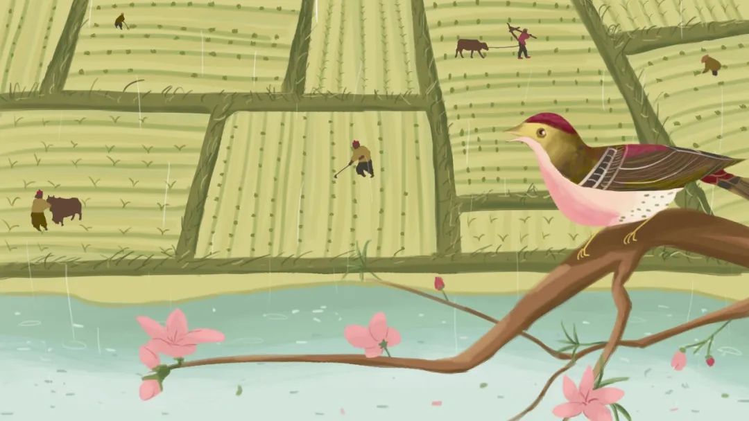 在田园间,春雨充满诗情画意,农人扶着犁站在山丘上,花丛外面不知何时落下一只白鸥。