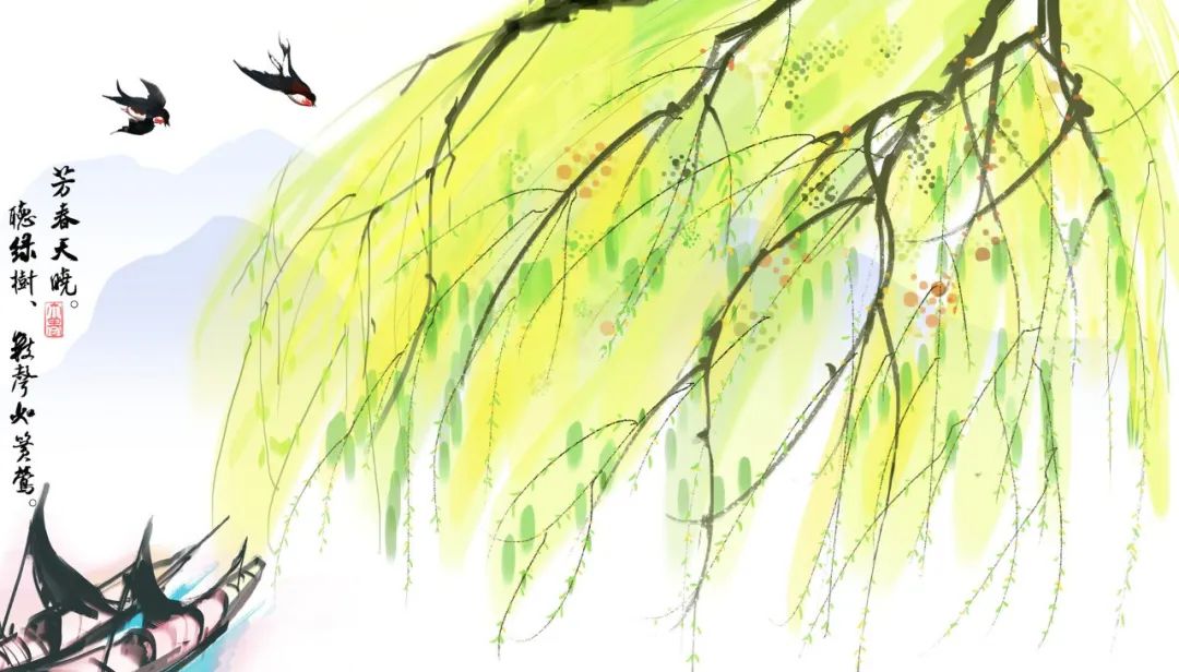 这是一幅春雨初霁图,水之绿、柳之黄、鸟之白,组成一幅色彩斑斓的春日图景。