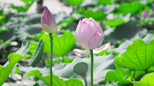 47、夏天,池塘里的荷花纷纷绽开了粉嫩美丽的笑颜。