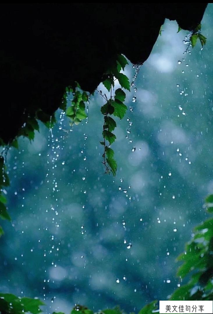 14、 “嘀嗒——嘀嗒——淅淅沥沥——”这就是雨那灵动的声音,用生命敲击世界的声音,雨,滴落在屋檐瓦楞之间,飘洒在花草树木之中,融入了江河湖海之上。这一种又一种雨的足音,不正像一个个音符,组成了一曲优美动听的歌谣吗?