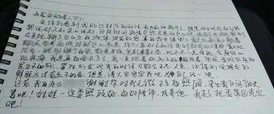 据女子老公刘先生介绍,许女士患病后长期输液,但是病情没有好转,离家出走时给家人留下了一张字条。字条中写到:“在你们看到这封信的时候,我也应该离开了。”“输了这么久的液体不见好转,我很绝望……吃不下一点东西……请大家宽容我吧,为自己活一次。”“我的老公,谢谢你对我无微不至的照顾,来生我们再做夫妻,娃娃一定要照顾好。”“我走了,把我带回老家吧。”