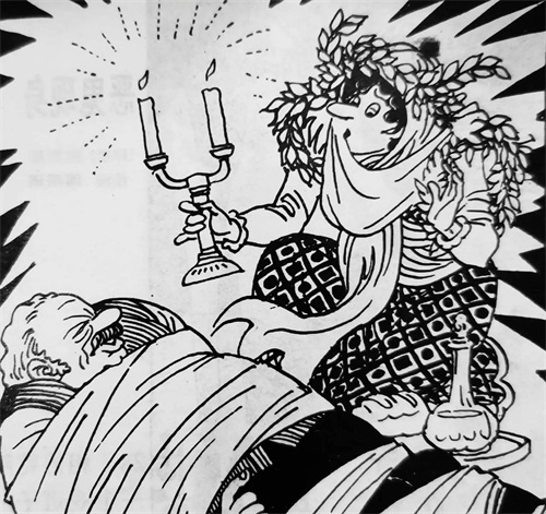 妻子答:“我是地狱女神,专给拘禁在黑墓里的人送饭。”那人不假思索地嚷道:“你不送酒?”