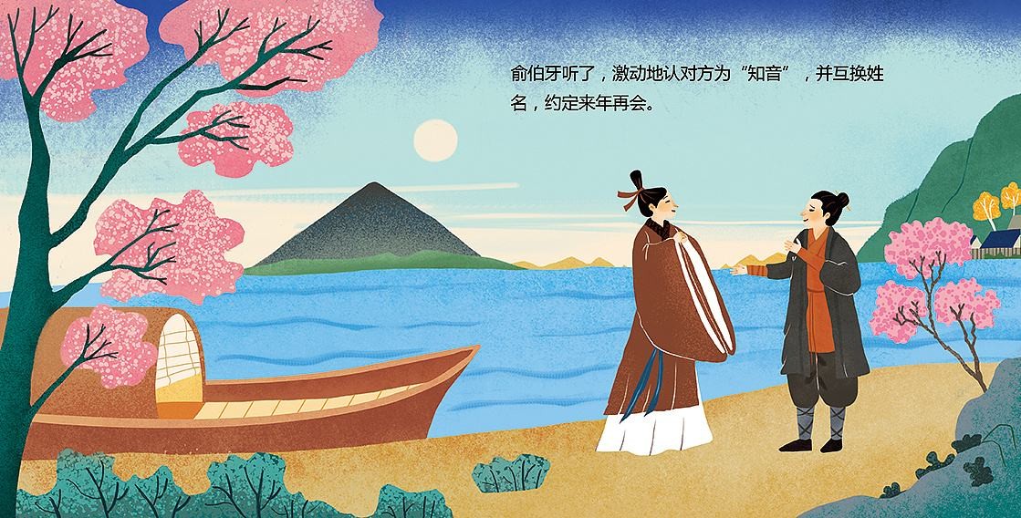 伯牙弹琴,钟子期聆听。刚开始,琴声似在赞美着巍巍的高山。钟子期说:“弹得真好啊!仿佛见到了高耸入云的泰山。”过了一会儿,琴声又似表现出奔腾澎湃的波涛,钟子期又说:“弹得真好啊!宽广浩荡,波涛滚滚如江河。”钟子期死后,伯牙摔琴,断弦,一辈子不再弹琴了,他觉得世上再也没有像钟子期那样的知音值得自己为他弹奏了。