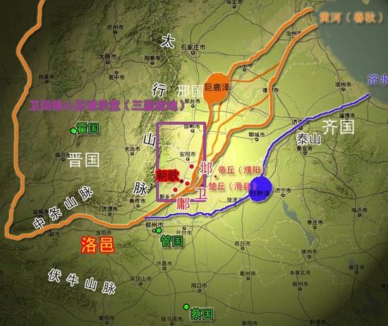为了防范纣王儿子组织叛乱,在朝歌的东、南、北三面设置了三个封地卫、鄘yōng(今河南汲县)、邶bèi(今河南汤阴),分别安排三个兄弟老三管叔姬鲜,老五蔡叔姬度、老八霍叔姬去统治,将纣王儿子武庚围起来进行监督,史称“三监”。