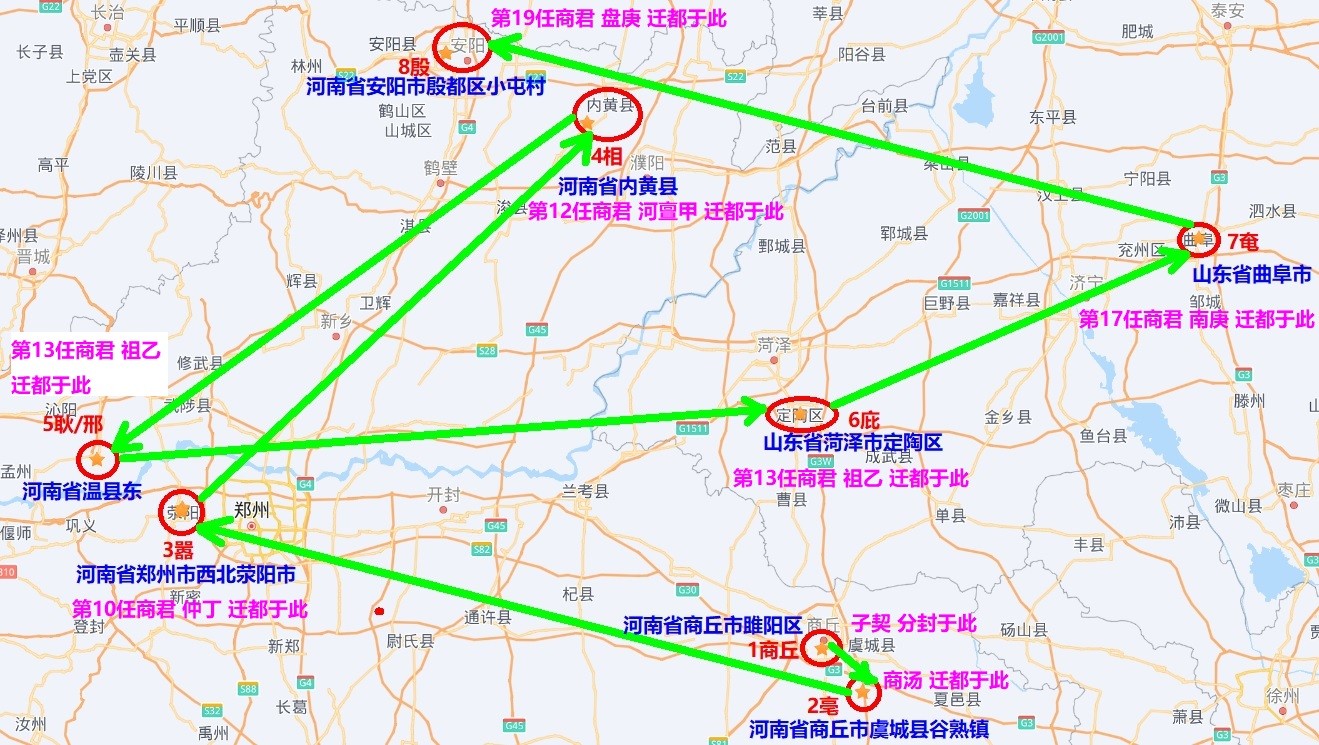 在九世之乱期间,为了避免王室争斗,历任商君曾多次进行迁都。先是第10任商君子庄(仲丁)将国都从商汤时期的亳(今河南商丘市虞城县谷熟镇)迁移至嚣(今河南郑州市西北的荥阳市);随后第12任商君子整(河亶甲)将国都迁移至相(今河南内黄县);第13任商君子腾(祖乙)将国都迁移至耿/邢(今河南温县东),后因为洪水冲击不得不再次迁都至东面的庇(今山东菏泽市定陶区),第17任商君子更南庚继位后再次迁都至东面的奄(今山东曲阜市)。
