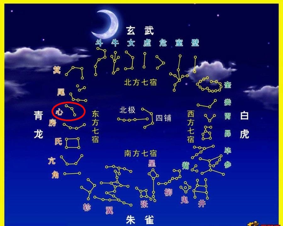 在尧当政的时期,子契因为协助大禹治水有功而被分封在商地(今河南商丘市),同时被任命为火正兼任司徒,火正这个职位,一方面负责管理火种,将火用于农耕、祭祀甚至战争中,另一方面负责观测星象,主要是观测大火星的运行规律,在二十八星宿的东方七宿中有个心宿(下图红圈所示),又叫火星、商星。子契通过观察这颗星在一年之中运行而规律,来定农时、分季节,告知百姓何时开始春耕、何时开始秋收,指导当时的农业生产。司徒一职,负责掌管土地和教化人民,与其担任的火正一职一脉相承,火正通过观测形象得出的一些农业生产的规律和时令季节,通过司徒一职教化的形式让百姓掌握生产技能,提高农业生产的效率。