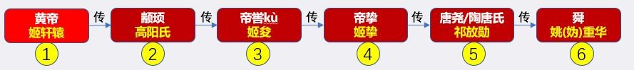 《史记·五帝本纪》记载:帝喾高辛者,黄帝之曾孙也。高辛父曰蟜极jiǎo,蟜极父曰玄嚣xiāo,玄嚣父曰黄帝。自玄嚣与蟜极皆不得在位,至高辛即帝位。高辛於颛顼zhuānxū为族子。