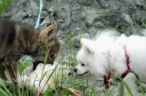 格林刚刚进入藏獒的领地时,被藏獒吓得躲在一边不敢活动。不过,很快它狼的天性便被激发了出来,它开始朝藏獒吼叫,并试探着朝藏獒走去。