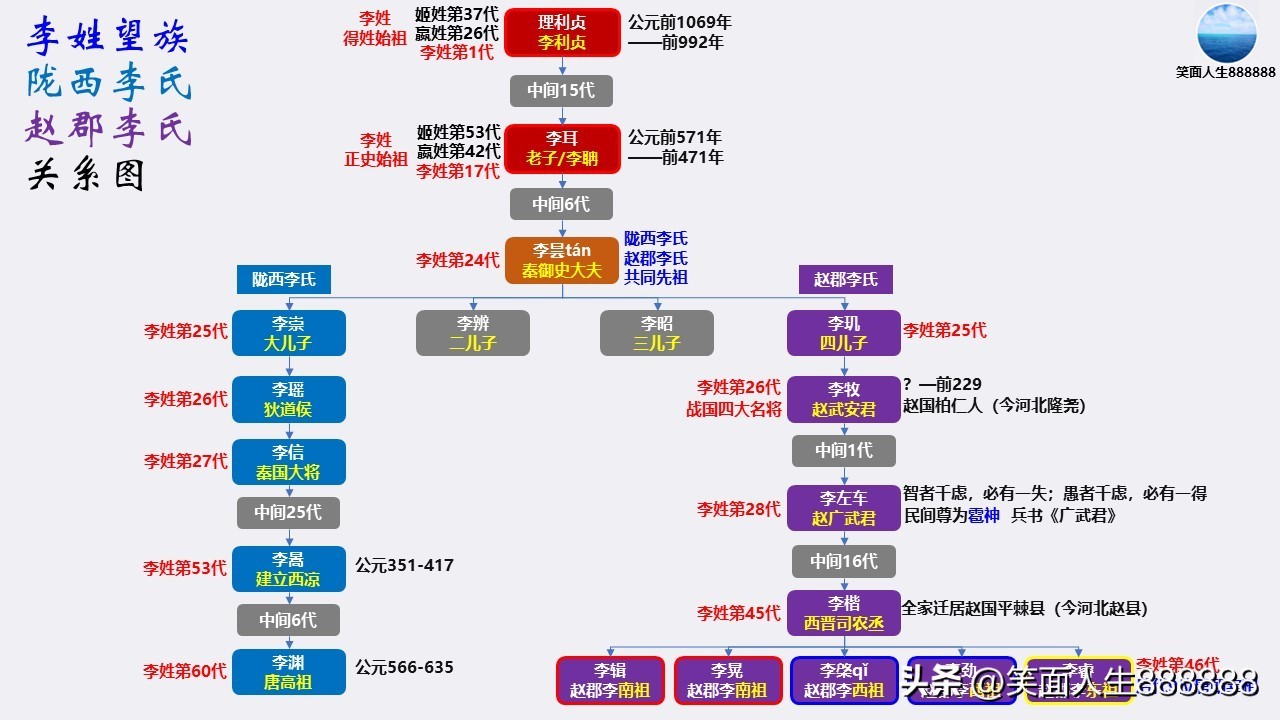 6.陇西李氏和赵郡李氏两大望族共祖李昙,赵柏人侯,封于柏人即今河北隆尧。