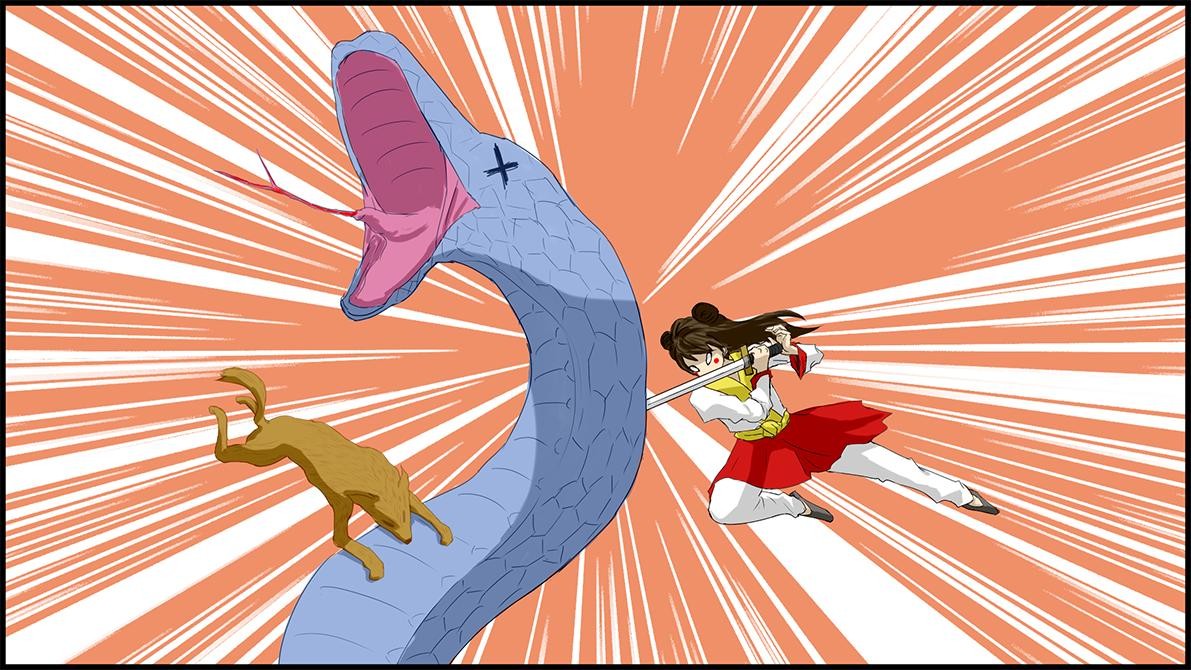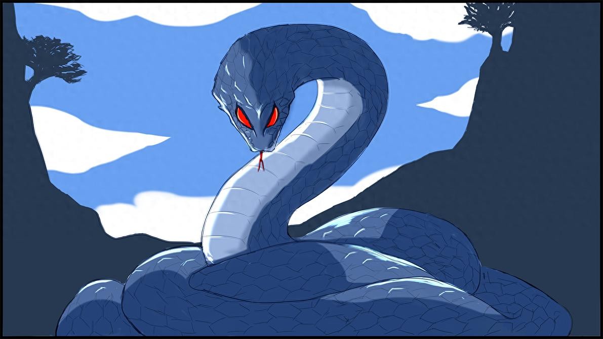 直到夜幕初上,李寄将大馅饼烤出香味,丢到了洞口,自己则悄悄地潜伏在庭院的阴影之中。不一会儿,大蛇出洞觅食。但见那蛇,头颅硕大宛如圆顶谷仓,双目幽幽好似二尺铜镜。它方从洞中探出了一小部分身体,便已引得腥风阵阵,令人作呕。饥肠辘辘的大蛇闻到了糍粑的香味,张开血盆大口,只一口就将诱饵整个吞下。怎料这馅饼又糯又粘,堵在蛇喉教它一时难以下咽。李寄见它中计,忙放犬去咬。大蛇口不能用,怒而踊至庭中,欲缠住猎狗将其勒毙。但凡蛇类,颈后三七之处为心脏所在,名曰“七寸”。李寄待到大蛇与狗斗作一团,要害毕露,便蹑足而上,狠狠一剑刺入其七寸。大蛇吃痛,发出嘶嘶之声,反身撞来,李寄灵巧避过,又补了数剑,随后跃至一旁。