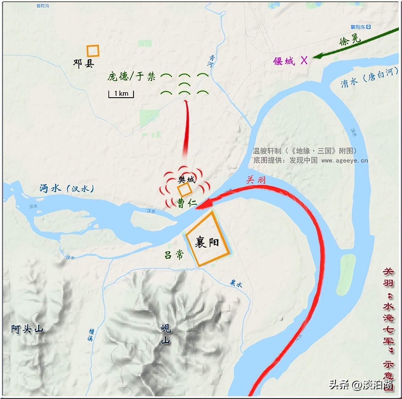 三国时期,关羽率领大军进攻樊城(现在湖北襄阳),曹操派了于禁、庞德两员大将率领七支精兵前去增援。不久,樊城一带下了一场大雨,汉水猛涨,于禁的军营扎在低处,大水把七军军营淹没了。于禁和他的将士找个高地避水。关羽率领水军进攻。把于禁围住,于禁被逼投降。庞德不降被斩,关羽从此名震中原。