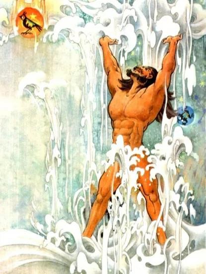这斧头确实厉害,几下劈过去,就听见天崩地裂般的巨响,轰隆隆一声接着一声,随后便看到周围云雾一样的混沌被劈开一条巨缝,巨缝中有光照进来。盘古正要欢呼,没想到刚刚劈开的巨缝眼见又要合拢起来,盘古急忙扔下斧头,直起身子用手和脚撑开这缝隙。