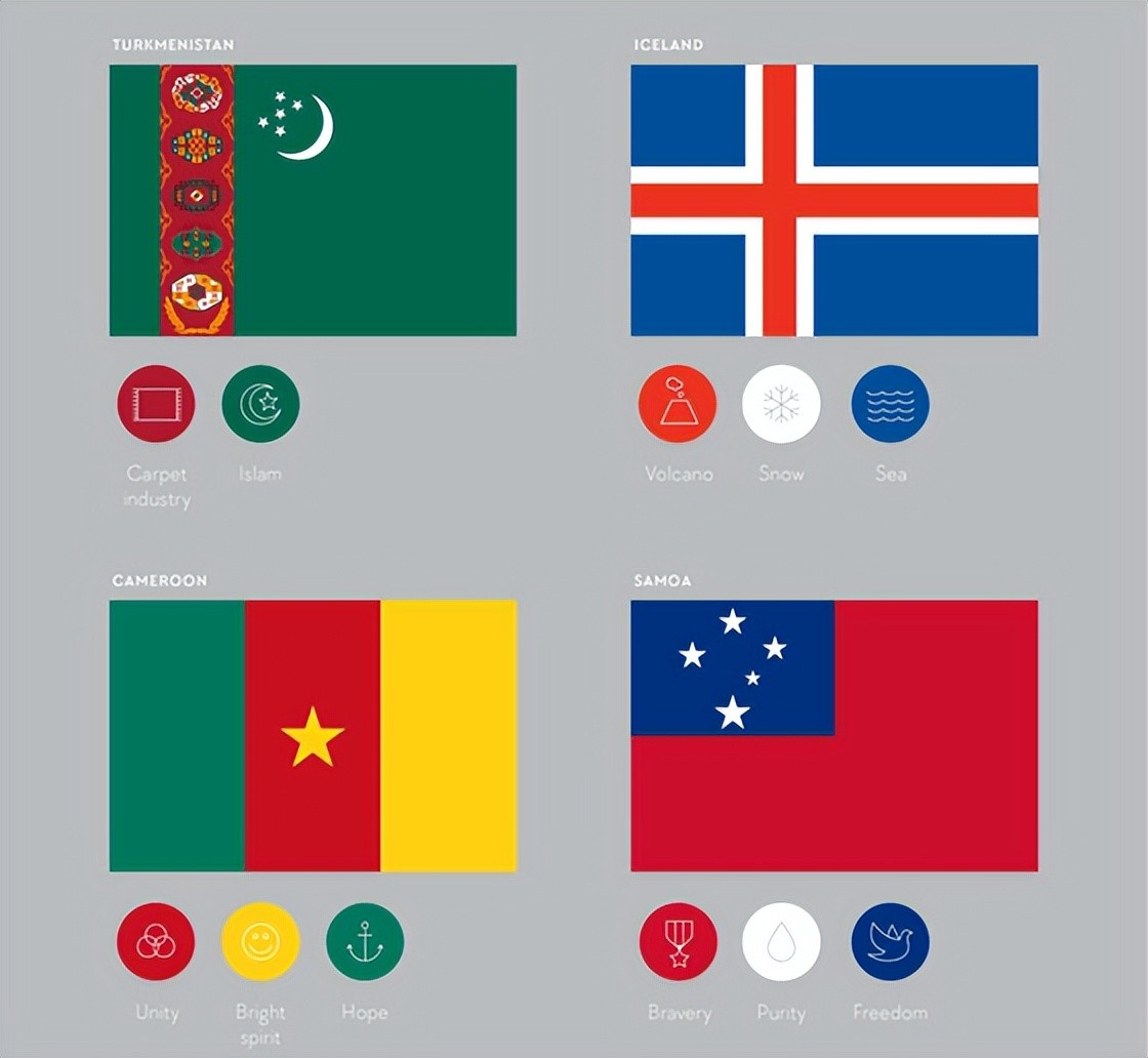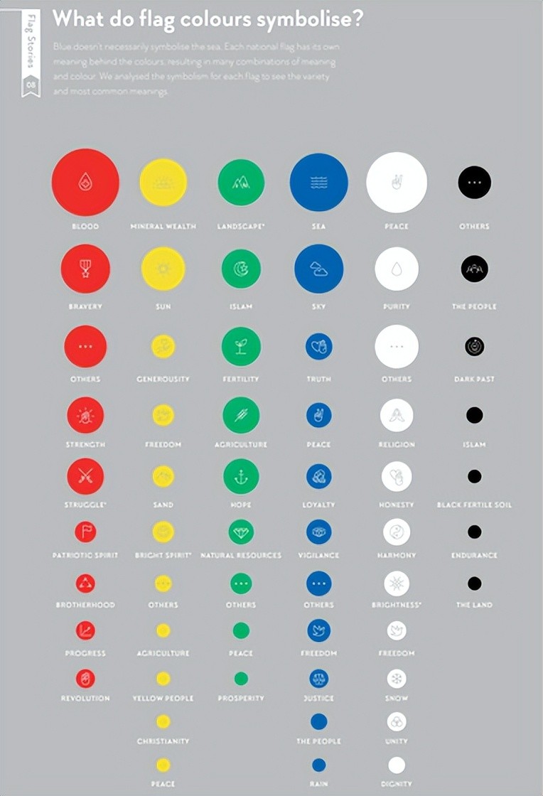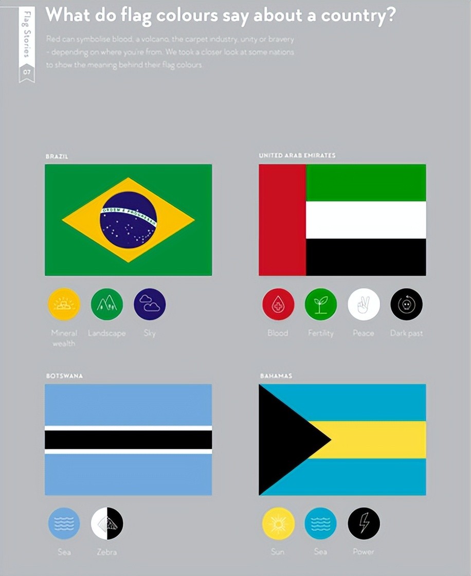 例如,巴西国旗的黄色表示“资源”,绿色表示“自然”,蓝色表示“天空”,但在阿拉伯联合酋长国国旗中,绿色表示“富饶的土地”。此外,在博茨瓦纳,国旗的白色和黑色代表“斑马”,但巴哈马国旗的黑色代表“雷霆”。