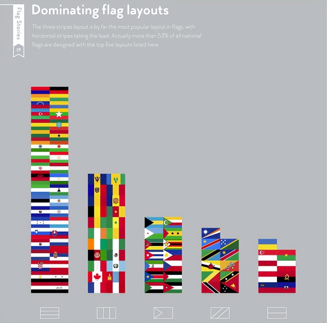 三条水平线的设计旗帜最多,其次是三条垂直线的布局。全世界53%的旗帜适用于“水平三条线”“垂直三条线”“三角形和水平线”“对角线”“垂直两条线”设计之一。