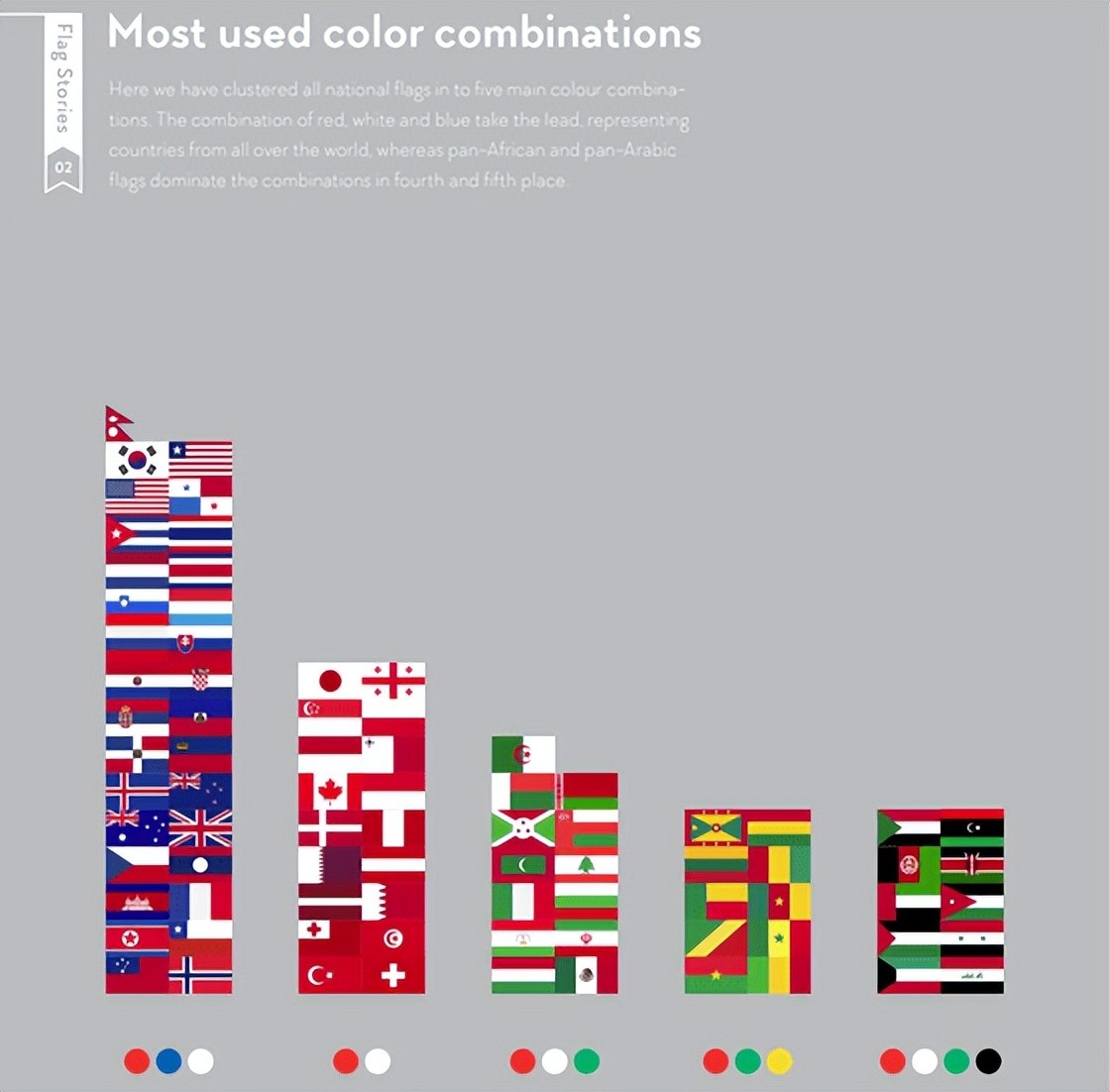 最常见的组合是红色、蓝色、白色三色。非洲有许多红色,绿色和黄色的国旗,以及红色的组合·白色 ·绿色 ·黑色在阿拉伯国家经常使用。