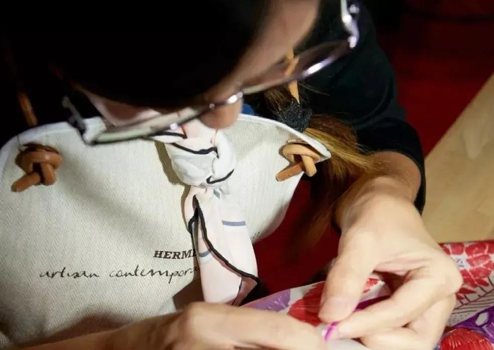 直到今天,爱马仕丝巾仍然坚持手工卷边。爱马仕丝巾的卷边是看不到针脚的,这需要手工师傅技术非常娴熟,至少费时 30 分钟才能完成一条。