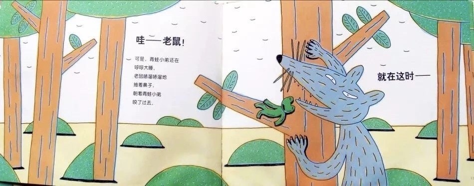 哇——老鼠!可是,青蛙小弟还在呼呼大睡。老鼠哧溜哧溜地抽着鼻子,朝着青蛙小弟咬了过去。就在这时——