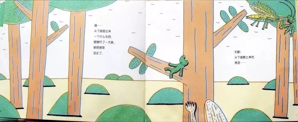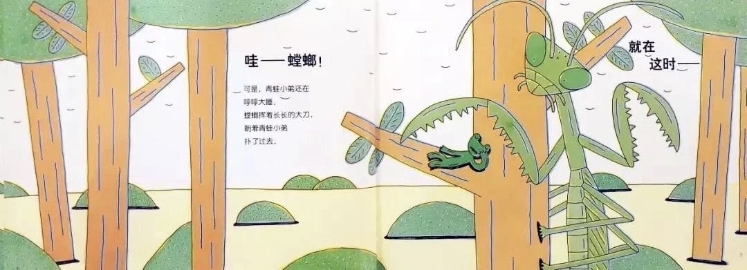 哇——螳螂!可是,青蛙小弟还在呼呼大睡。螳螂挥着长长的大刀,朝着青蛙小弟扑了过去。就在这时——