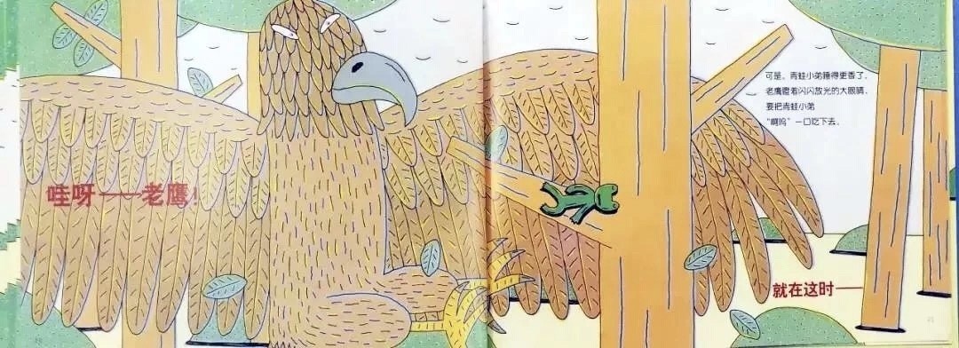 哇呀——老鹰!可是,青蛙小弟睡得更香了。老鹰瞪着闪闪发光的大眼睛,要把青蛙小弟“啊呜”一口吃下去。就在这时——