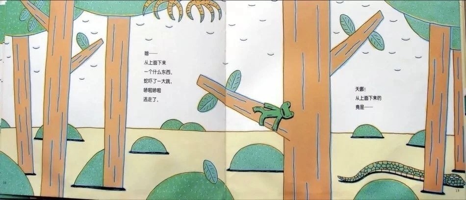哇呀——蛇!可是,青蛙小弟还在呼呼大睡。蛇张开大嘴,咝咝咝地吐着舌头,要把青蛙小弟一口吞下去。就在这时——