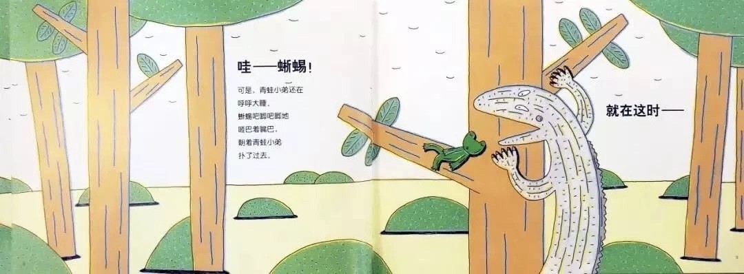 哇——蜥蜴!可是,青蛙小弟还在呼呼大睡。蜥蜴吧唧吧唧地咂巴着嘴巴,朝着青蛙小弟扑了过去。就在这时——